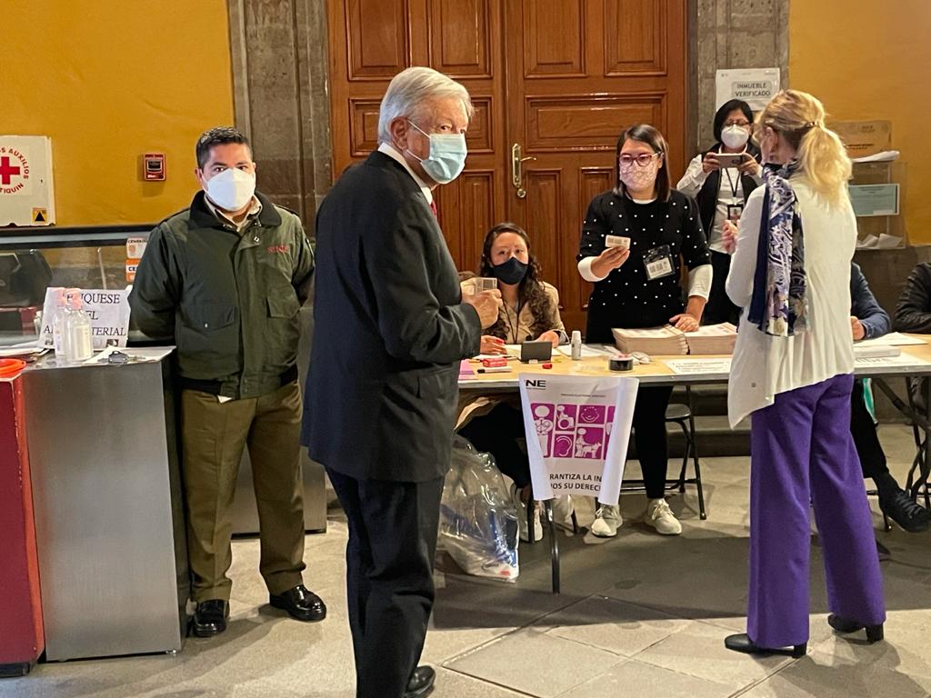 Cuando creíamos estar muy cerca de la hora de apertura y no veíamos electores haciendo fila comenzó el murmullo de que aquí votaba ¨alguien¨ importante. Efectivamente, a los pocos minutos aparecieron el presidente López Obrador y la primera dama quienes posaron brevemente para la prensa e ingresaron al recinto. Con poco aspaviento y solo saludos de cabeza recibieron sus papeletas para diputados federales, alcaldes y cargos en ayuntamientos y emitieron sus votos. Nuevas venias de cabeza seguidos de un par de breves ¡Viva México! Y eso fue, no hubo intercambios con la prensa ni con el magro público que había empezado a alinearse para votar.