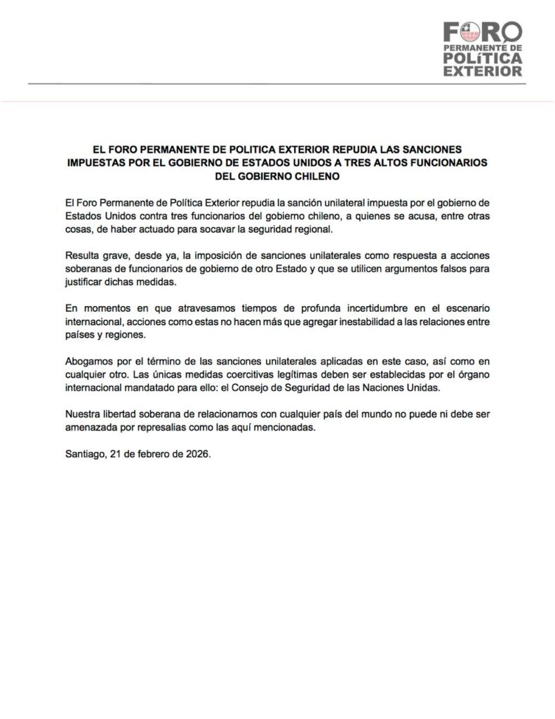 El foro permanente de política exterior repudia las sanciones impuestas por el gobierno de estados unidos a tres altos funcionarios del gobierno chileno.